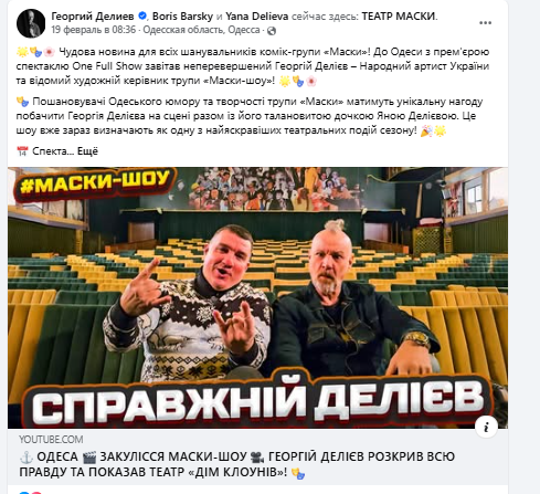 Звезда "Маски-шоу" молчит об атаках россиян на Одессу, хотя весной 2022 года посетил город, а в феврале 2025 года выступил вместе со своей дочерью Яной на сцене театра "Дом клоунов" со своим спектаклем One Full Show.