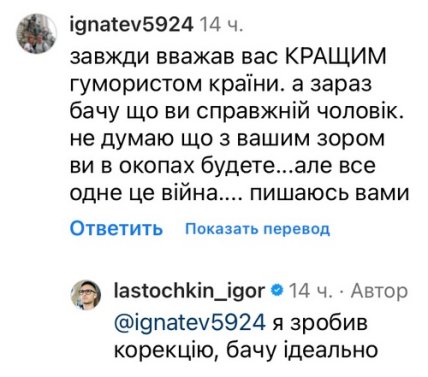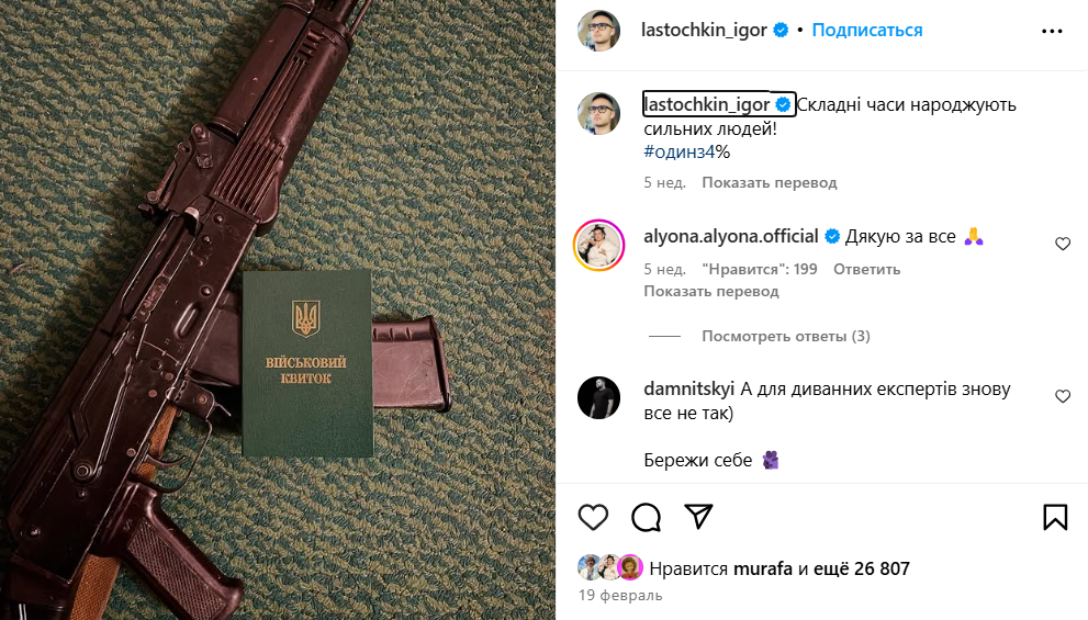 Стоит отметить, что Игорь Ласточкин — не единственный представитель украинского шоу-бизнеса, приобщившийся к защите Родины. Писатель Сергей Жадан также мобилизовался в Нацгвардию, а участник группы Nazva Павел Гоц присоединился к ВСУ. Участник "Лиги смеха" Виктор Розовый защищал нашу страну, но получил ранения и демобилизовался. Также воюют актер и ведущий Даниэль Салем, лидер группы "Бумбокс" Андрей Хливнюк, комик из "Львов на джипе" Андрей Лузан, экс-фронтмен группы "Коррупция" Миша Крупин, актриса Мария Агапитова, фронтмен группы "Фиолет" Сергей Мартынюк, актер Владимир Николаев.