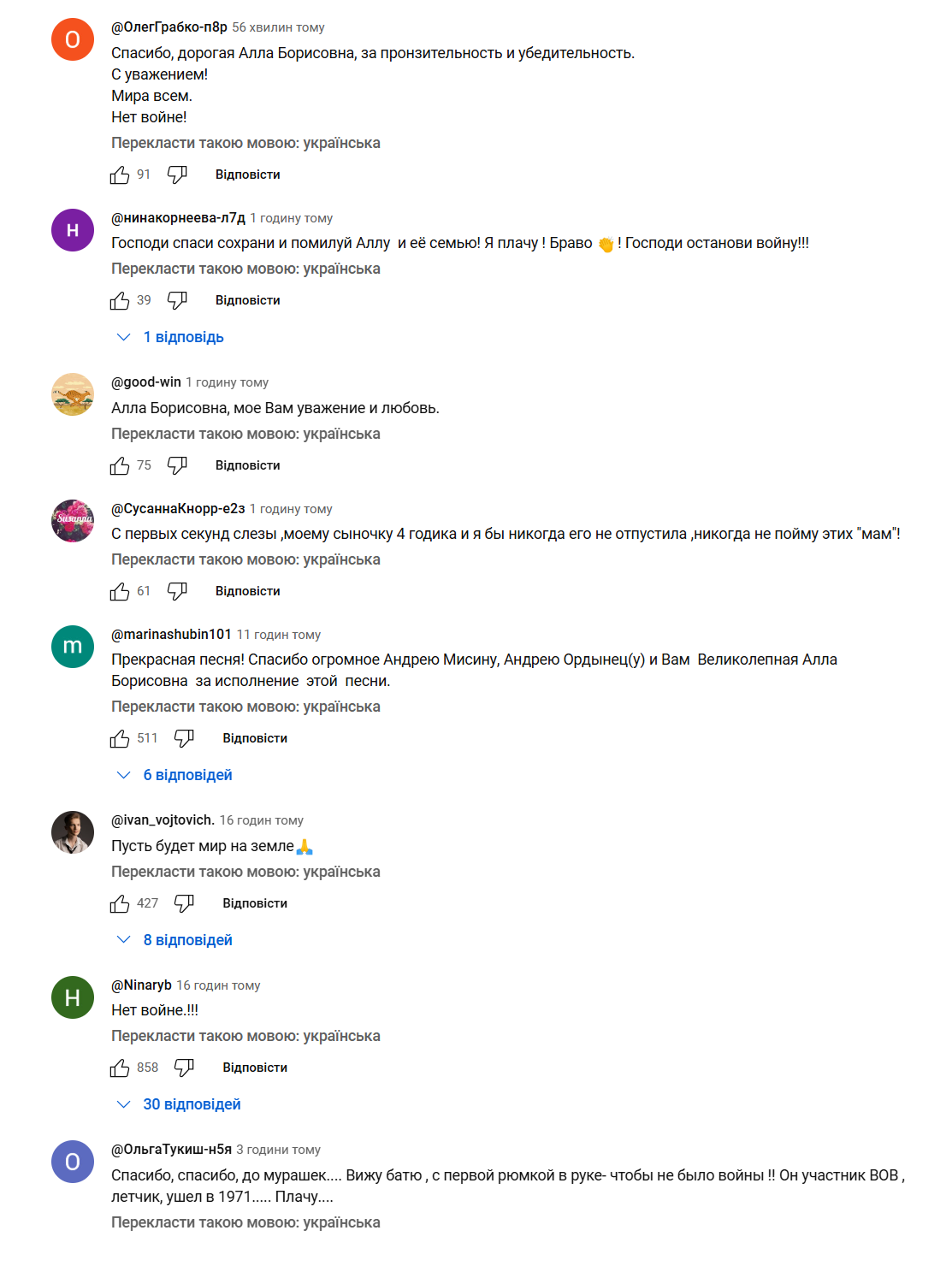 Надо сказать, что россияне бурно отреагировали на новые песни от Аллы Пугачевой, ведь она в последнее время не так часто делает музыкальные премьеры и практически не выступает. Многие россияне пишут восторженные комментарии и слова благодарности за такие трогательные песни о войне.
