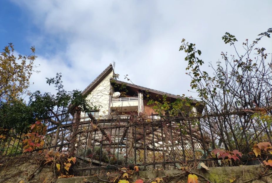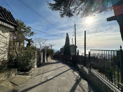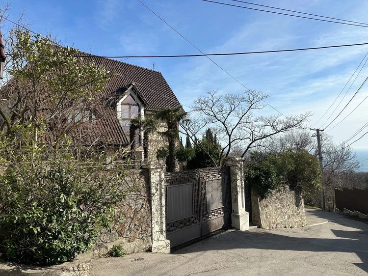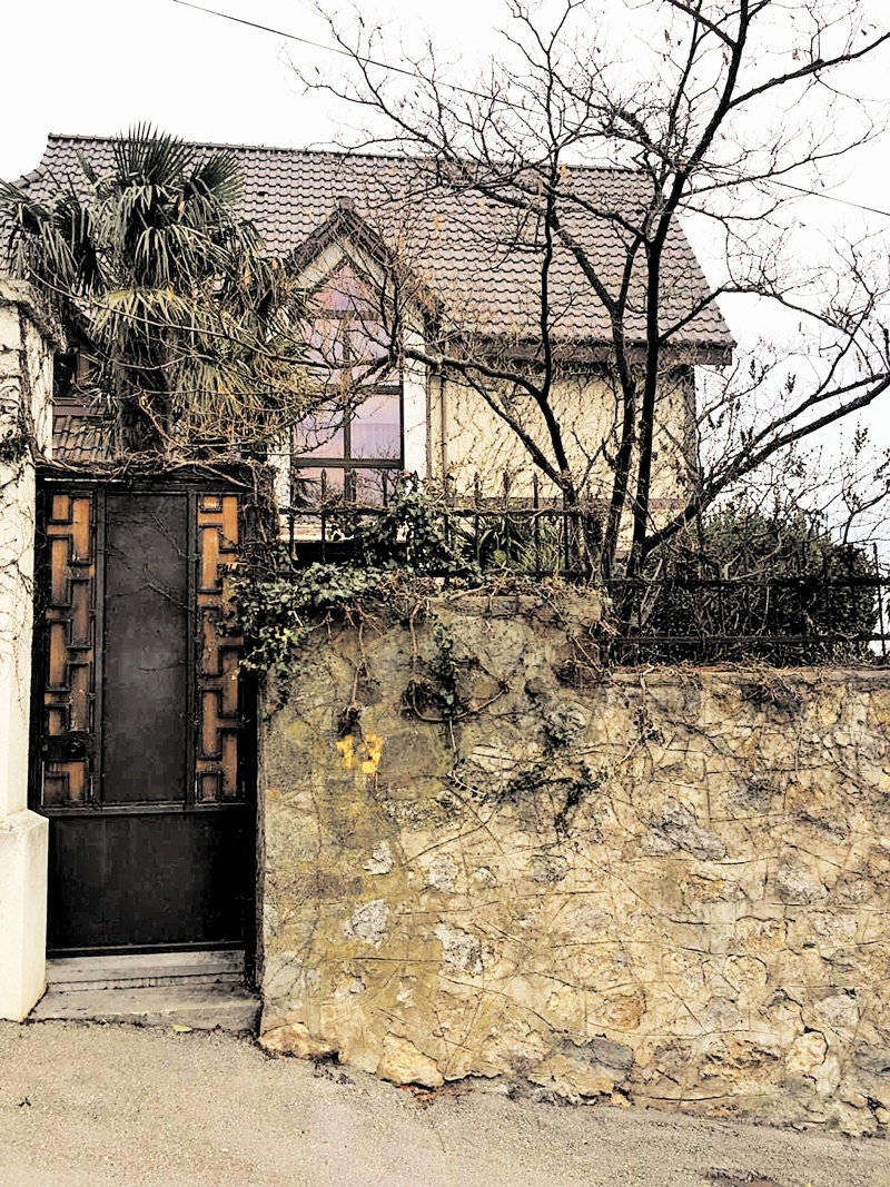 Дача в Никите находится на угловом участке и возвышается над дорогой, ведущей к Никитскому ботаническому саду. Территория обнесена подпорной стеной примерно 4-метровой высоты, а с балконов открывается вид на море.