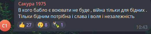 - "У кого бабло есть воевать не будет, война только для бедных. Только бедным нужна и слава и свобода и независимость"