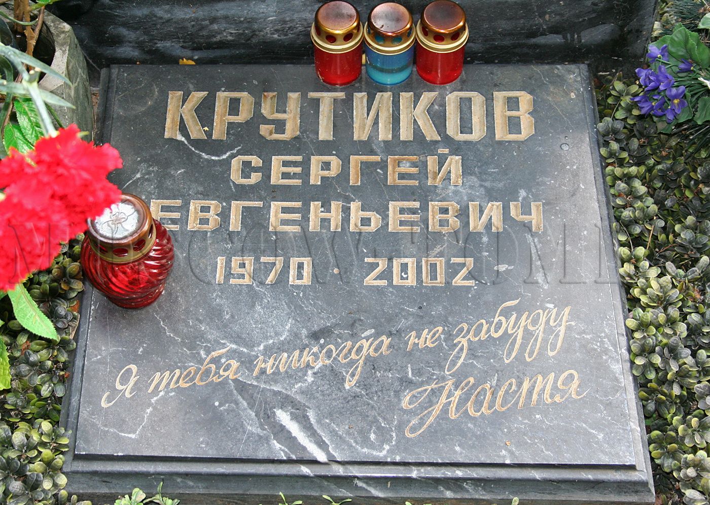 У подножия постамента установлена табличка с надписью: "Крутиков Сергей Евгеньевич 1970–2002. Я тебя никогда не забуду. Настя". Эскиз памятника создала возлюбленная Сергея — Анастасия Фильченко. При жизни артист не состоял в браке и не имел детей.