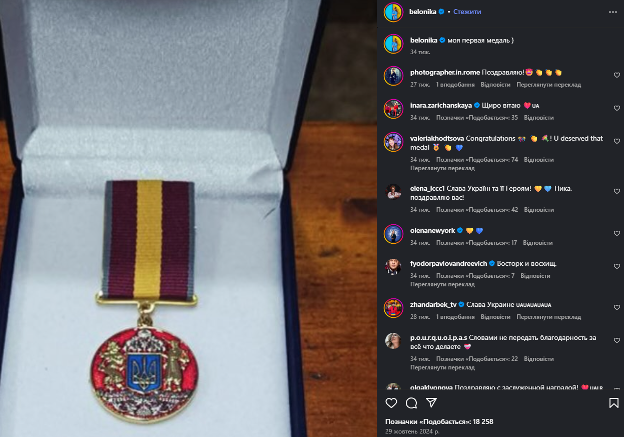 В октябре 2024 года "хорошая русская" похвасталась в соцсетях фото с наградой — позолоченной медалью с украинским гербом. "Моя первая медаль", — подписала снимок Вероника.