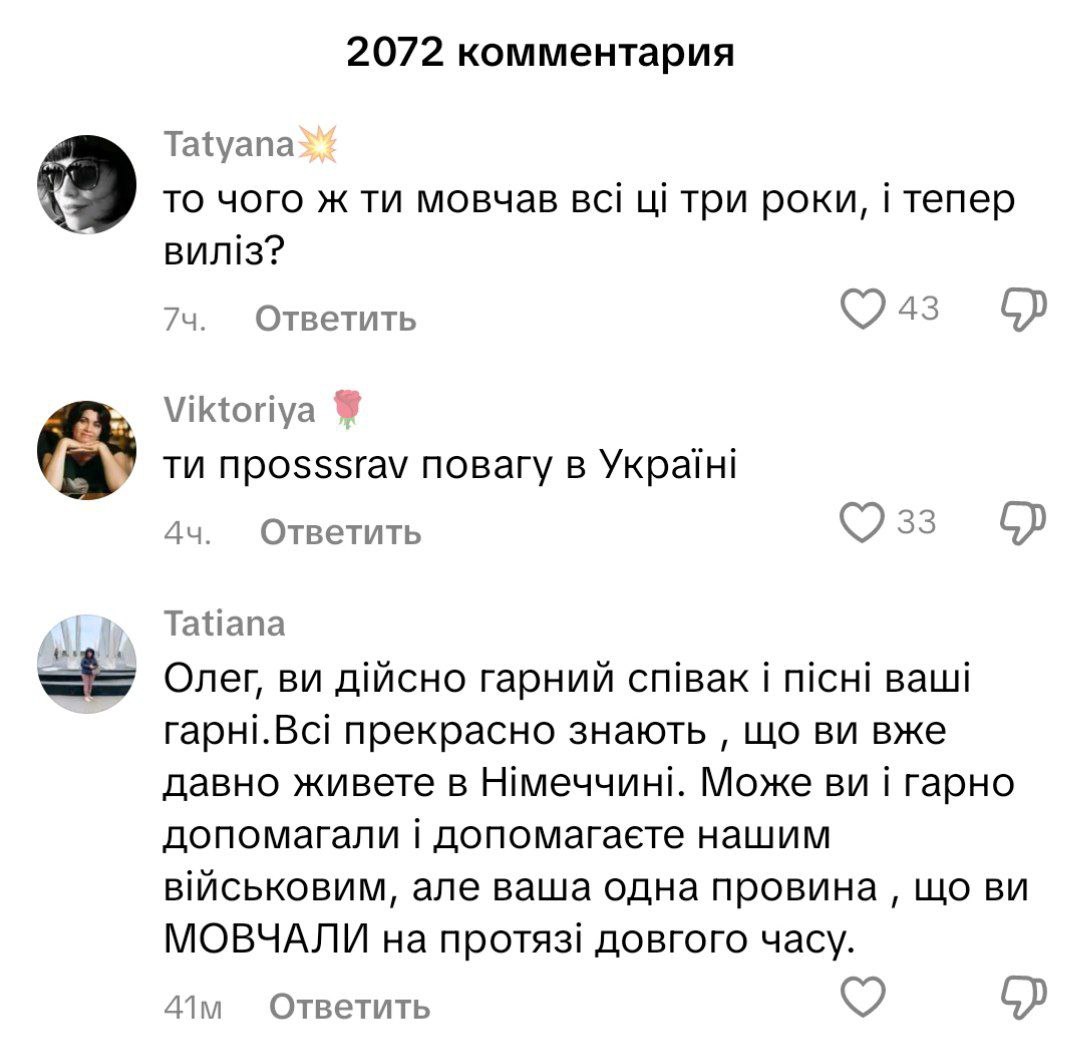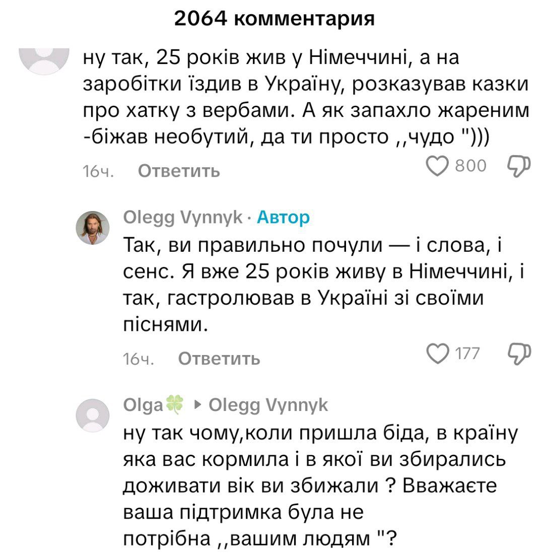 На своей странице в TikTok Олег Винник опубликовал видеоролики, в которым рассказал, что на самом деле он не сбежал из Украины. Артист "внезапно вспомнил", что уже 25 лет живет в Германии, в этой стране родился его сын и более того, все свои хиты он писал в Германии.