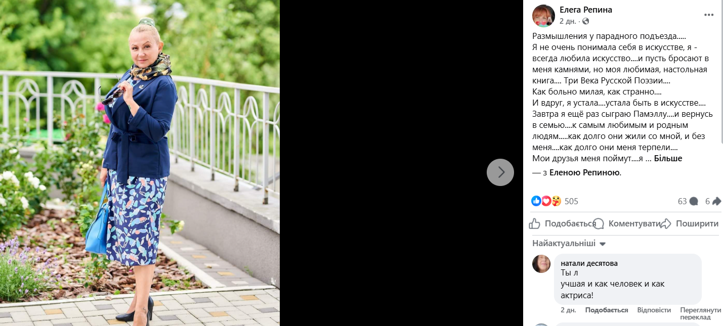 Елена Репина — украинская актриса театра и кино, известная по ролям в сериалах " Слуга народа", "Папик", "Однажды под Полтавой", которая отличилась антиукраинскими высказываниями. Ранее в СМИ писали, что она живет за границей, но, похоже, актриса находится в Украине вместе с мужем.