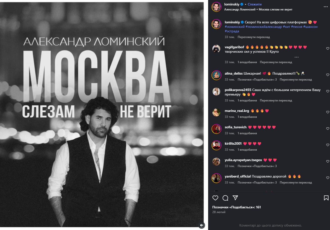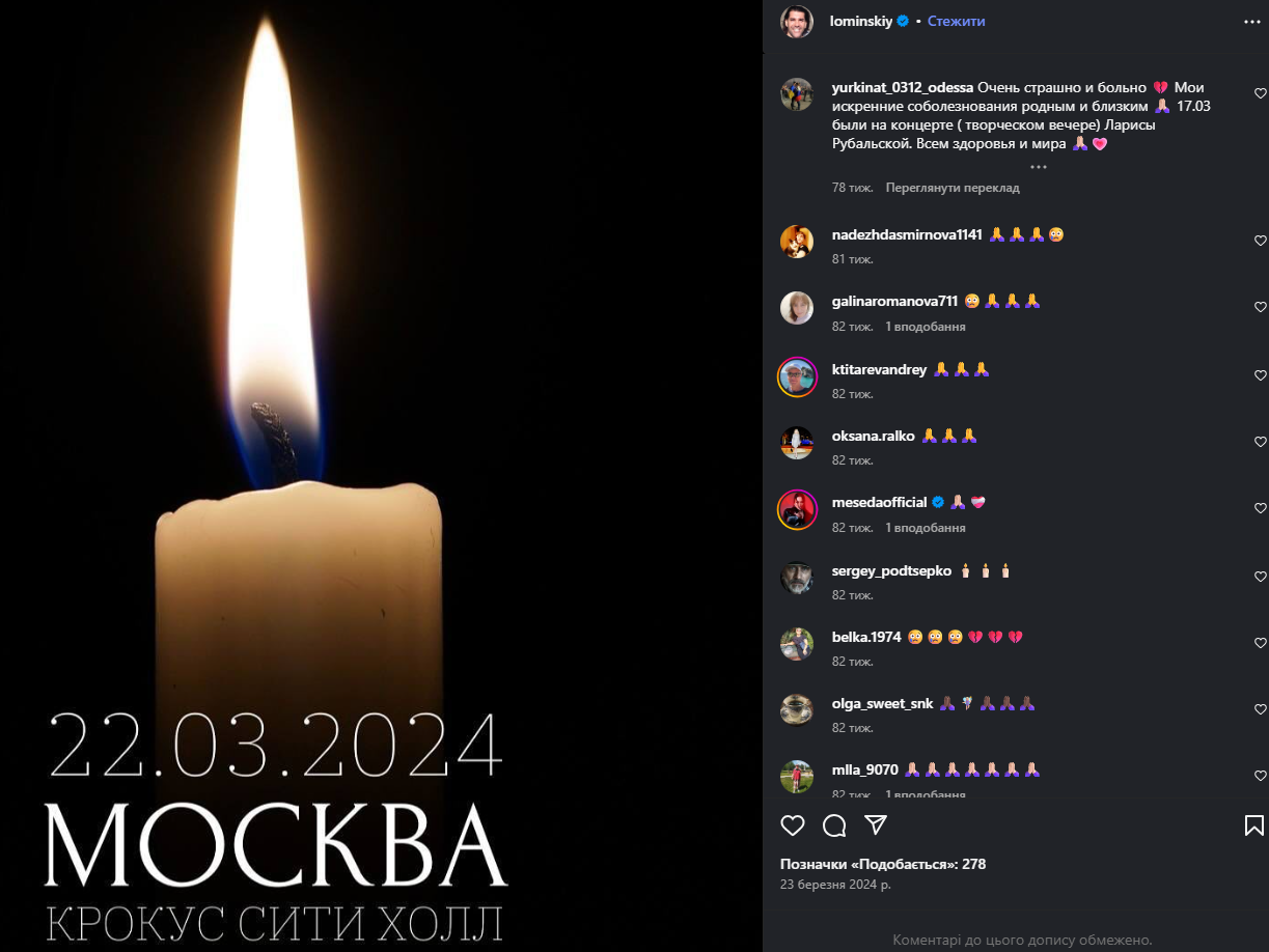 В марте 2024 года Ломинский посочувствовал россиянам, которые погибли во время теракта в подмосковном ТРЦ "Крокус Сити". Однако самому певцу наплевать на судьбу украинцев, с которыми он вырос и учился.