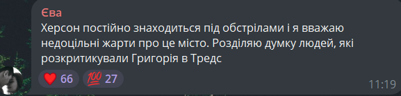 Херсон постоянно находится под обстрелами, и я считаю нецелесообразные шутки об этом городе. Разделяю мнение людей, раскритиковавших Григория в Тредсе
