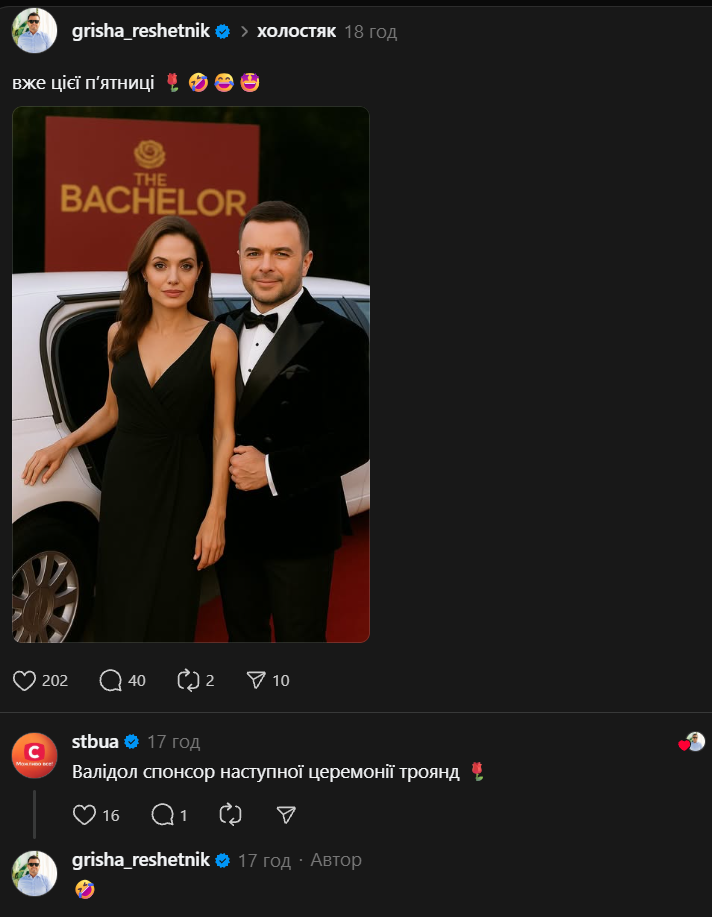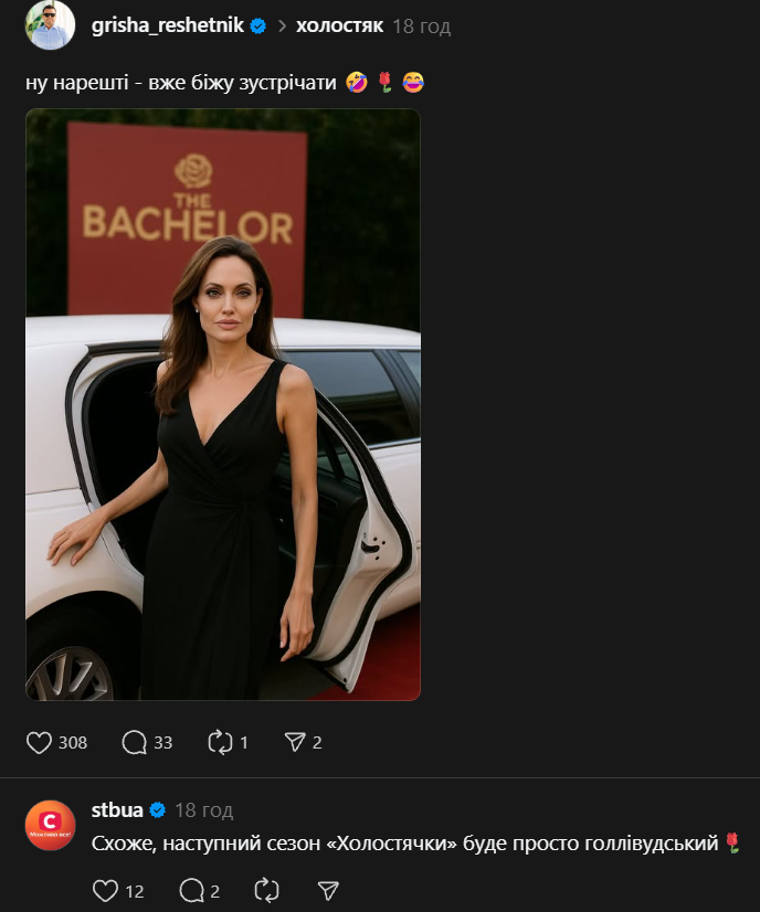 "Знакомьтесь — наша новенькая", "ну наконец — уже бегу встречать", — написал Решетник, подкрепив сообщения сгенерированными ИИ фото Джоли как участницы шоу "Холостячка". Своего мужа в комментариях поддержала Кристина Решетник, а также сам аккаунт канала СТБ, на котором и работает ведущий.
