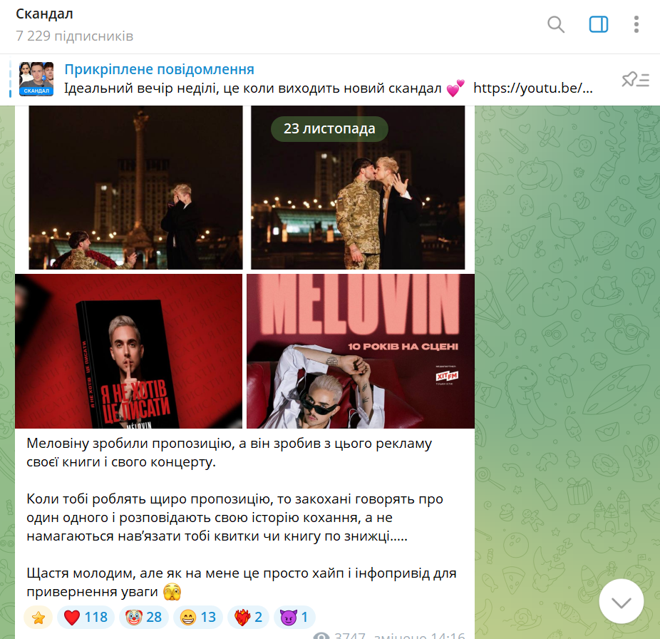 Однако в этом посте артист выложил не только снимки с предложения, но и рекламу книги, которую он написал, и сольного концерта в Киеве. Мнение о том, что это действительно постановка, высказал блогер Ваня Рассел в интервью Славе Демину.