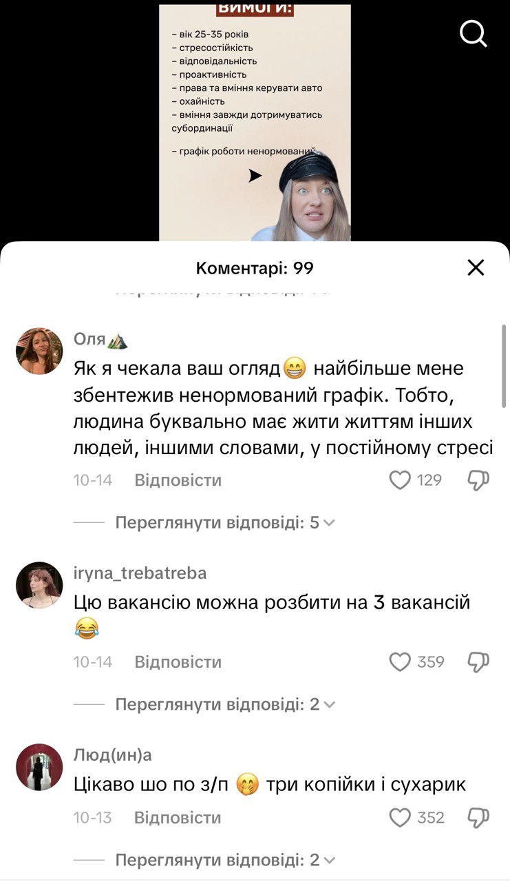 По словам блогерши с ником bez_pontovaya, вакансия недолго продержалась в сети — пост быстро исчез, а пока был доступен, комментарии под ним были закрыты. Мало того, что Кот и Татаринцева указали желаемый возраст будущего ассистента (25-35), что запрещено законом Украины, в объявлении было указано, что график ненормирован.
