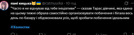 - "Часто я не чувствовал от тебя инициативы" — сказал Тарас девушке, которая единственная на этой неделе выбрала самостоятельно организовывать свидание и бегала весь день по базару и обзванивала всех, чтобы сделать свидание идеальным"