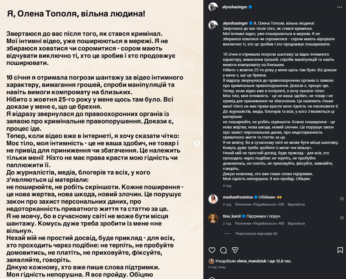 В понедельник, 19 января 2026 года, Елена Тополя сообщила в Инстаграме, что ее шантажировали угрозами обнародования интимных видео, которые впоследствии уже появились в сети. По ее словам, это началось еще 10 января.