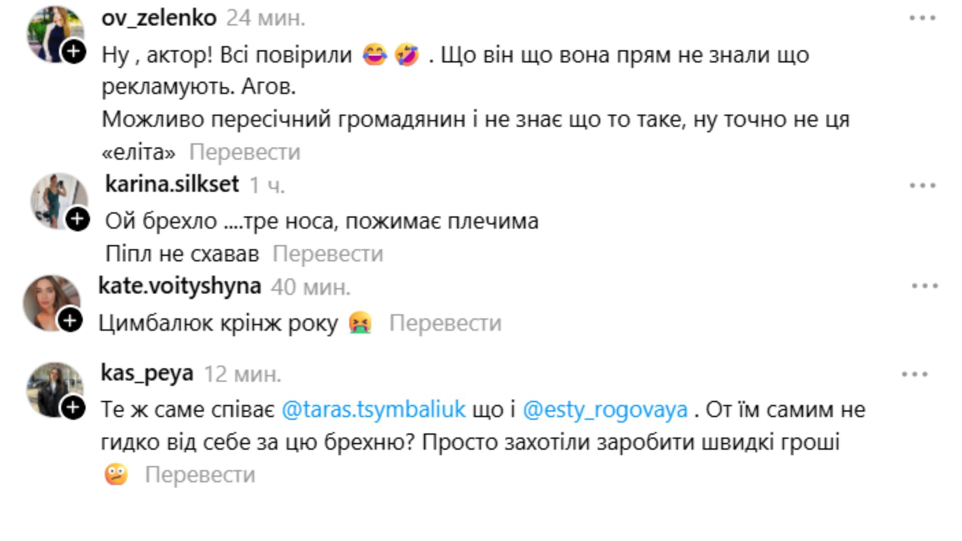 • "То же самое поет @taras.tsymbaliuk, что и @esty_rogovaya. Вот им самим не противно от себя за эту ложь? Просто захотели заработать быстрые деньги".