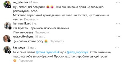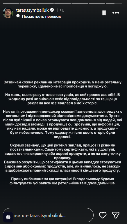 Одна из пользователей Threads опубликовала пост с извинениями Цимбалюка. Другие пользователи в комментариях пишут, что не верят в то, что Цимбалюк не знал, что он рекламирует.