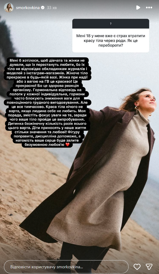 Одна из подписчиц спросила Анну, как не бояться потерять былую красоту из-за беременности. Кошмал не заставила себя ждать с ответом в сторис, призвав женщин отказаться от навязанных стереотипов.