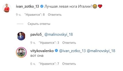 Защитник "Кривбасса" Иван Зотько на страничке Коваленко в Instagram намекнул, что у Виктора лучшая левая нога в Италии. Хавбек "Специи" скромно отметил, что лучшая левая нога у Руслана Малиновского из "Аталанты".