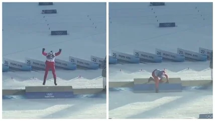 Представитель Олимпийского комитета России (ОКР) Александр Большунов так обрадовался победе в скиатлоне на Олимпийских играх в Пекине, что повредил пьедестал.