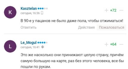 "В 90-е годы у нас все спортивные объекты позакрывались. Мальчишки приходили в армию и отжаться не могли… Благодаря путину все вернулось. Сегодня мы спорт вернули. И мы сегодня действительно настоящая спортивная держава!