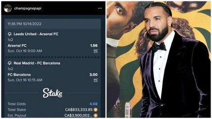 Если ставка сыграет, то Дрейк заработает 3,9 млн канадских долларов (2,89 млн евро).