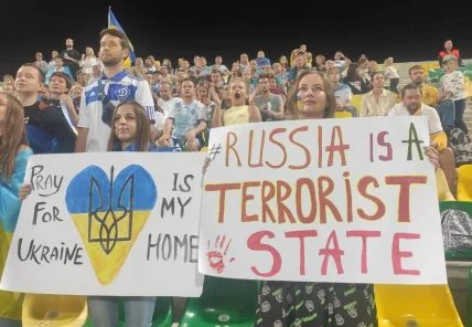 Увы, настроение украинским болельщикам на стадионе испортили местные стюарды. Они отобрали у девушки плакат с надписью "россия – страна-террорист", сообщает Ґрунт.