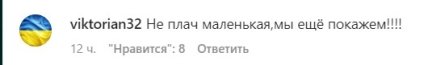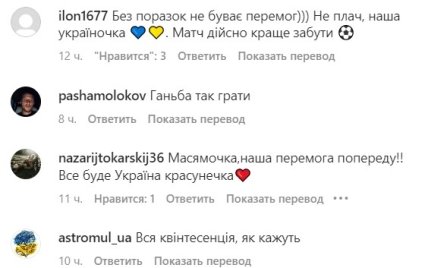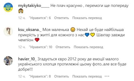 "Не плач маленькая, мы еще покажем!", "Не плачь красавица, победы еще впереди", "Моя маленькая. Пусть это будет самая большая досада в жизни для каждого из нас. Шахтер — всегда чемпион", "Без поражений не бывает побед. Не плачь, наша украиночка. Матч действительно лучше забыть", — писали болельщики под постом Денисова.