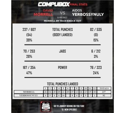 Регулярный чемпион WBA во втором среднем весе Дэвид Моррелл победил нокаутом обязательного претендента Айдоса Ербосынулы в поединке, который стал главным событием вечера бокса в Миннеаполисе. Здесь же свою очередную победу добыл украинец Федор Черкашин.
