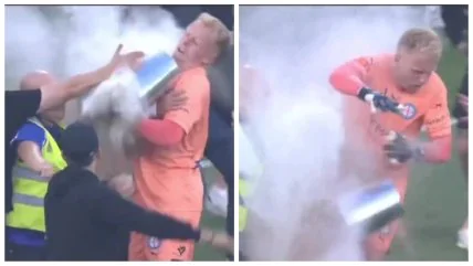 На 21-й минуте встречи на поле была выпущена сигнальная ракета, пишет The Sun. Вратарь "Сити" Том Гловер, не долго думая, схватил ракету и бросил назад на трибуны. Это и дало старт беспорядкам. Фанаты выбежали на поле и один из них ударил голкипера ведром. Откуда у болельщика в руках оказалось ведро, стоит только догадываться.