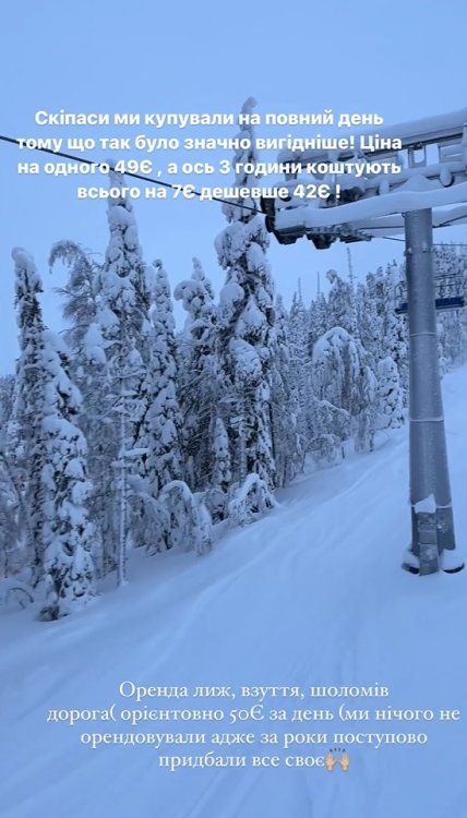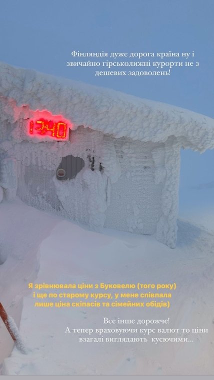 "Финляндия — очень дорогая страна. Я сравнивала цены с прошлогодним Буковелем, то у меня совпала лишь цена ски-пасов и семейных обедов. Все остальное — тут дороже", — делится со своими подписчиками Бех.
