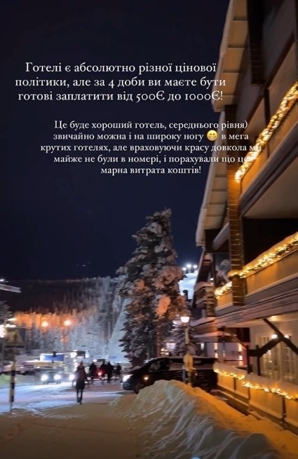 А теперь Марина в сторис Instagram поделилась с подписчиками ценами в курортной Лапландии. По словам девушки, вышло дороже чем в Буковеле.