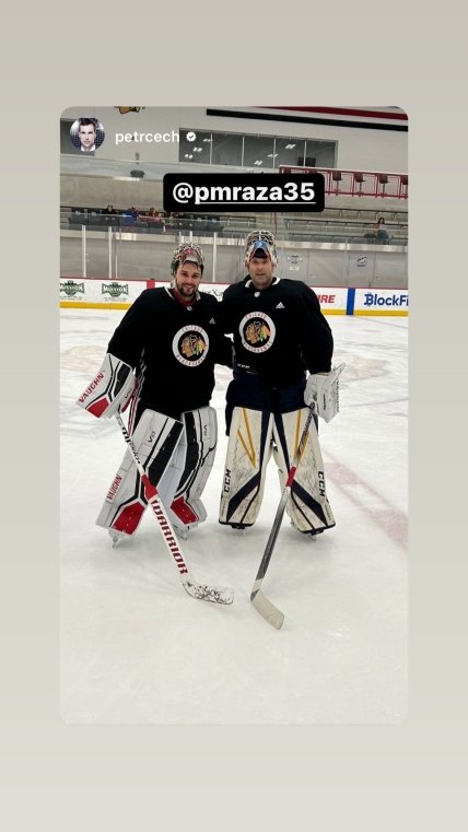 Петр приехал в Чикаго, чтобы навестить вратаря "Блэкхокс" Петра Мразека. Они дружат уже много лет, хоккеист ранее приезжал в гости к Петру в Лондон. Перед хоккейной тренировкой оба вратаря вышли на футбольное поле. Мразек бил Чеху пенальти и забил два гола после пяти ударов.