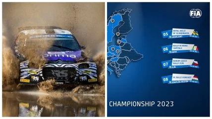Данное изображение доступно на сайте ERC в разделе "Календарь на 2023 год". Кроме того, на изображении можно рассмотреть логотип Международной автомобильной федерации (FIA), под патронатом которой организовываются гонки ERC.