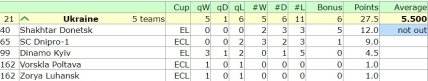 Вот сколько очков в таблицу коэффициентов УЕФА заработали украинские команды в этом сезоне: "Шахтер" — 12, "Днепр-1" — 9, "Динамо" — 4,5, "Ворскла" — 1, "Заря" — 1.
