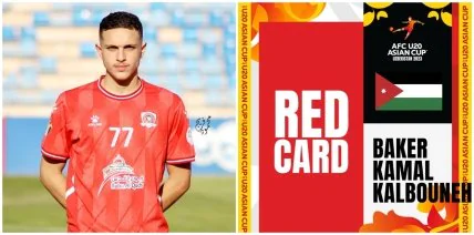 Сразу после стартового свистка игрок сборной Иордании Бакер Калбоунеху пошел в атаку, но в борьбе за мяч влетел ногой в голову соперника, за что был был удален с поля.