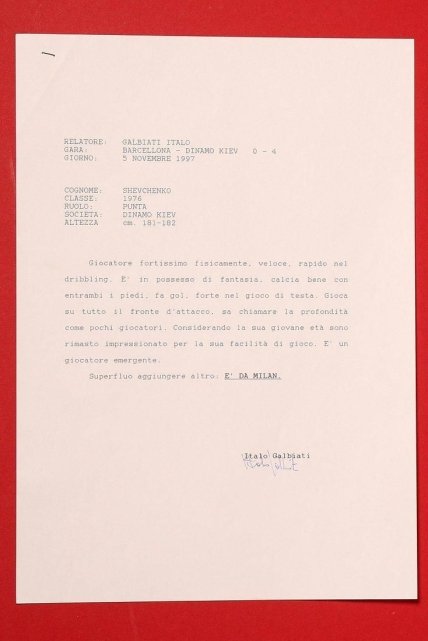 "Шевченко очень сильный физически. Быстрый. Ловкий в дриблинге, фантастически удерживает мяч. Классно наносит удары с обеих ног. Забивает голы. Сильный в игре головой. Может сыграть в атаке на любой позиции. Имеет интенсивность, свойственную только нескольким игрокам. Учитывая его юный возраст, я был поражен тем, как легко все ему удается. Он является игроком нового типа. Жаль будет, если он перейдет в какую-то другую команду, а не в "Милан", — говорилось в отчете.