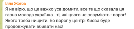Нашлось место и более детальному комментарию слов Селезневой: "Я не верю, что это трудно понять, все то, что сказала эта красивая молодая украинка… те, кто этого не понимают – враг! Которого нужно уничтожать. Ибо враг в центре Киева будет продолжать убивать нас!".