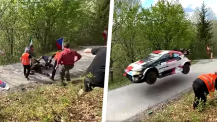 Сразу после того, как дорога была расчищена, внезапно появился экипаж Toyota GR Yaris. Современные автомобили WRC отличаются молниеносной скоростью, и пилоты обычно практически не имеют нормального обзора после очередного поворота или прыжка, полагаясь на подсказки своего штурмана.