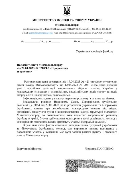 У меня нет информации о тексте обращения Украинской ассоциации футбола в Минмолодежьспорт, однако можем только догадываться, какие сильные аргументы привела УАФ, что Национальная сборная по футболу будет участвовать в отборе на Чемпионате Европы-2024 и Министерство эту информацию приняло к сведению, фактически разрешив брать участие в соревнованиях, в нарушение своего же приказа (интересно, что, судя по тексту письма, это был уже второй ответ, могу лишь предположить, что в первом ответе был отказ).