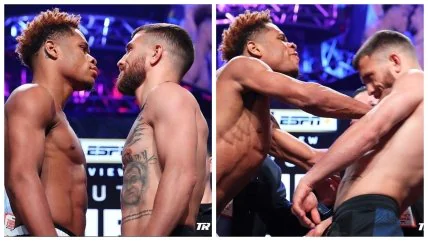 После взвешивания боксеры традиционно взглянули друг другу в глаза. В какой-то момент американец сильно толкнул украинца. Публика такие действия чемпиона не оценила и освистала его.
