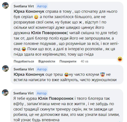 "Пока все, а дальше в интервью расскажу, как эта гнида сдала все руководство, потому что гнида. Я тебя, к***а, Юлия Поворознюк, и твоего блогера так в##у, что запомнишь меня на всю жизнь.