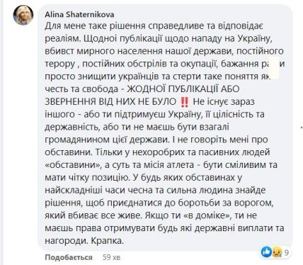 "Для меня такое решение справедливо и отвечает реалиям. Ни одной публикации о нападении на Украину, убийстве мирного населения нашего государства, постоянном терроре, постоянных обстрелах и оккупации, желании россии просто уничтожить украинцев и стереть такое понятие как честь и свобода — ни одной публикации или обращения от них не было.