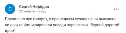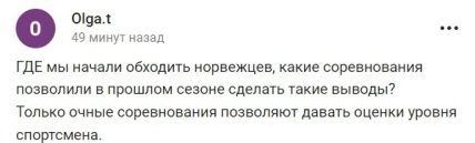 "Я уверена, что мы начинаем обходить Норвегию, нашего главного конкурента в мировых лыжах. Не знаю, почему наши репортеры и блогеры исписали миллион страниц в духе: "Ах, норвежцы, они на лыжи с детства встают, это у них в крови!" И у финнов в крови, и канадцев тоже в крови.