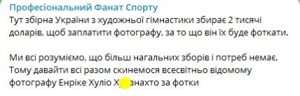 "Украинская федерация гимнастики не имеет никакого отношения к сбору средств на пребывание фотографа Энрико Делла Валле в штабе сборной Украины по художественной гимнастике во время чемпионата мира этого года.