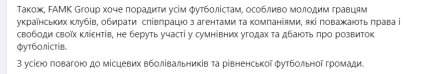 Соответствующий пост ФАМК разместило на своей странице в Facebook. Агенты пригрозили "Вересу", что в случае продолжения публичной атаки на их компанию, или продолжения любого нарушения прав и свобод Дмитрия — все детали и подробности этого дела станут известны всей футбольной общественности Украины.