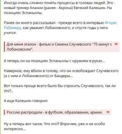 "Иногда очень сложно понять процессы в головах людей. Это — новый тренер "Алании" (ранее — "Акрона") Евгений Калешин. На позициях Эспаньолы.