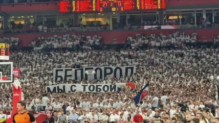 Болельщики сербской "Црвены Звезды" на матче Евролиги против "Партизана" (88:72) вывесили баннер в поддержку России. Накануне в городе Белгород (РФ) прогремела серия взрывов.