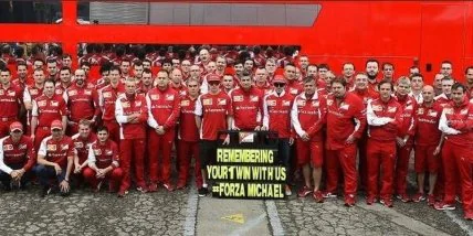 В воскресенье, 11 мая, команда Ferrari в паддоке трассы "Барселона-Каталония" поддержала Михаэля Шумахера. Члены команды, включая известных онщиков Фернандо Алонсо и Кими Райкконен, сфотографировались с пит-бордом, на котором было написано: "Помним твою первую победу с нами. Forza, Михаэль!". На Гран-при Испании, 18 лет назад, в 1996 году Шумахер одержал первую победу в составе Ferrari.