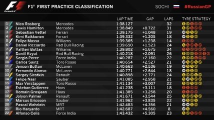 Также в десятку протокола попали Фелипе Масса, Даниэль Риккардо и Валттери Боттас. Российский гонщик Формулы-1 Даниил Квят на своем домашнем автодроме показал лишь восьмое время, уступив Росбергу две секунды. А следом за Даниилом расположились Серхио Перес и Карлос Сайнс на Форс Индии и Торо Россо соответственно.