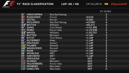 На 43-м круге резину сменил и Риккардо; выехал он после этого четвёртым, позади Ферстаппена, Райкконена и Феттеля. В оставшейся части гонки Райкконен подобрался к Ферстаппену, но обойти его не сумел. Так 18-летний голландец одержал свою первую победу в Ф-1.