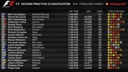 Лучшими во второй тренировке стали гонщики Ред Булл Макс Ферстаппен и Даниэль Риккардо, которые показали свои времени на самом мягком типе шин в Бельгии – SuperSoft. Время лидера сессии Ферстаппена составляет – 1.45,085, что на две десятые лучше чем у австралийца.
