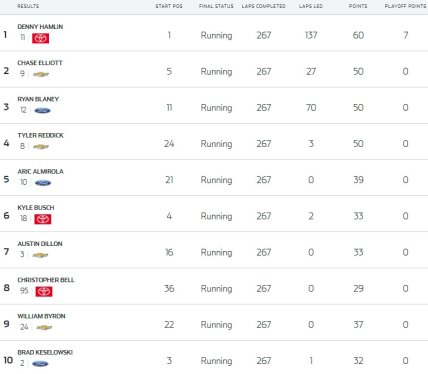 Вторым финишировал пилот Hendrick Motorsports Чейз Эллиотт, третьим – Райан Блэйни из Team Penske. Наибольшее количество кругов в гонке лидировал Хэмлин – 137 из 267. Он же выиграл и оба промежуточных финиша, заработав дополнительные баллы в плей-офф.